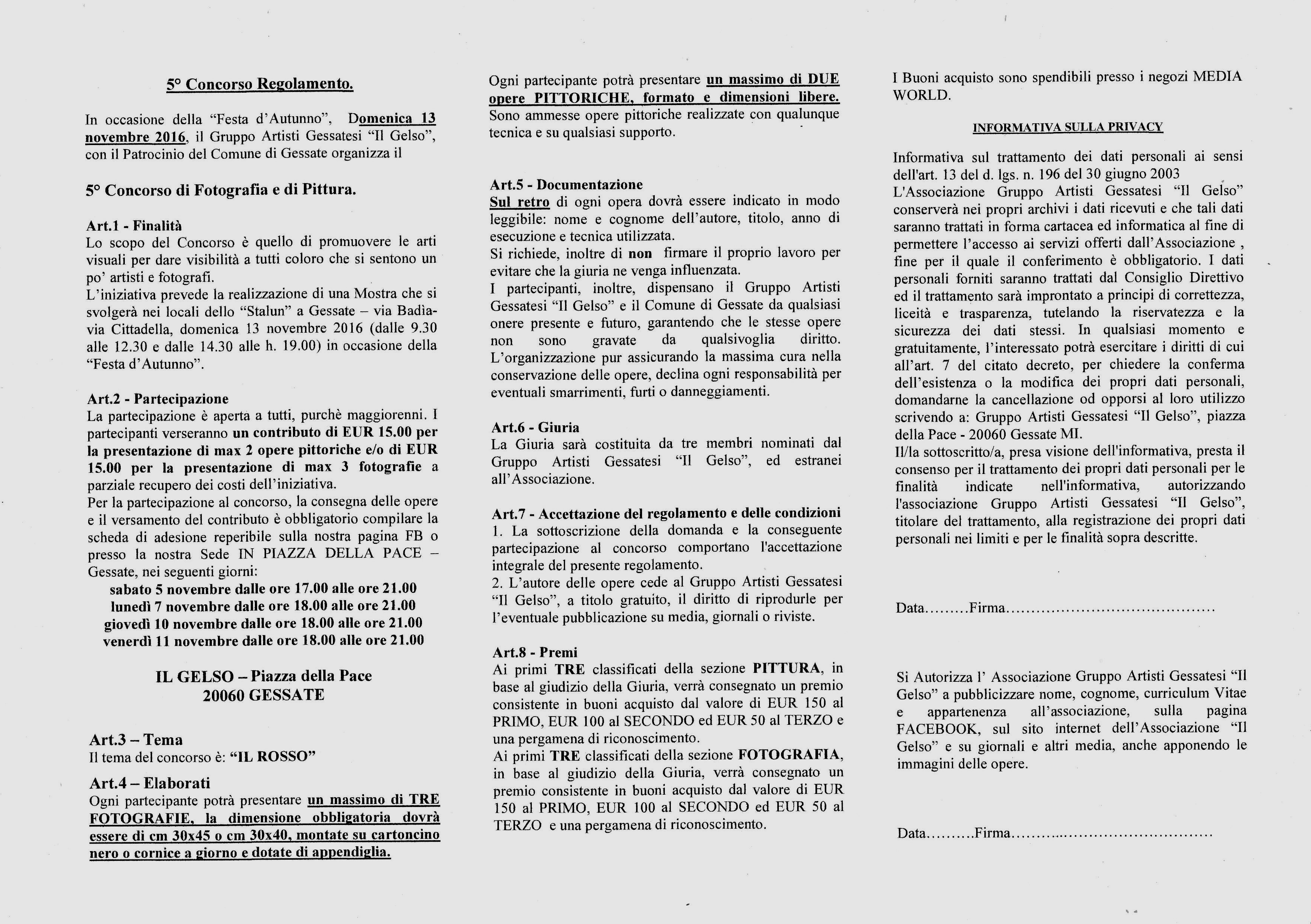 “Il rosso” è infatti il titolo della prossima mostra di fotografia e pittura che si terrà, con il Patrocinio del Comune di Gessate, presso i locali dello Stalun in via Cittadella. Per tutta la giornata di domenica 13 novembre infatti, in occasione della Festa di Autunno, verranno esposte le opere di coloro che parteciperanno al 5° concorso di fotografia lanciato dall’associazione (qui il regolamento dettagliato, la scheda da compilare va ritirata presso la sede di Piazza della Pace o richiesta via mail ad [email protected]).