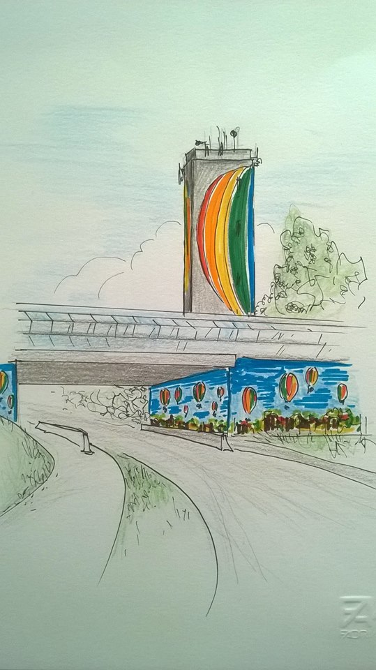 Anche questa volta le cartoline e la parte grafica, sono state ideate dalla Compagnia della Mongolfiera con il sostegno del celebre pittore Armando Fettolini, ma l’ispirazione artistica che ruota attorno all’aerostato, a Brugherio sta solleticando anche la fantasia di Lucia Sardi. L’artista già nota per diversi lavori svolti per il comune e per alcune sue incursioni artistiche in città (qui e qui un paio di articoli su di lei), è da anni che ragiona su un progetto ambizioso per la torre dell’acquedotto cittadina, immaginandola dipinta a tinte vivaci raffiguranti una mongolfiera per lato (visibile quindi anche dalla tangenziale), e in più con la decorazione colorata anche del sottopasso adiacente, per il quale Lucia immagina “da un lato lo skyline di Brugherio e dall’altro lo skyline di Le Puy en Velay con i cieli pieni di mongolfiere colorate” come scrive lei stessa su Facebook. Chissà che l’amministrazione possa farci un serio ragionamento per il prossimo anno ? Qui sotto un bozzetto dell’idea di Lucia Sardi.