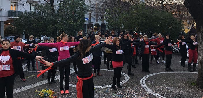Uomini e donne insieme per dire “no” alla violenza, uomini con sul petto l’adesivo “uomini che amano le donne” e donne che hanno ballato con il nastro rosso al polso, simbolo della catena spezzata, sulle note di “Break the chains”. “Un milione di persone che risorge”, questo il titolo del flash mob, titolo che fa riferimento a una statistica triste quanto vera: una donna su tre, nella propria vita, ha subito o subirà violenza.