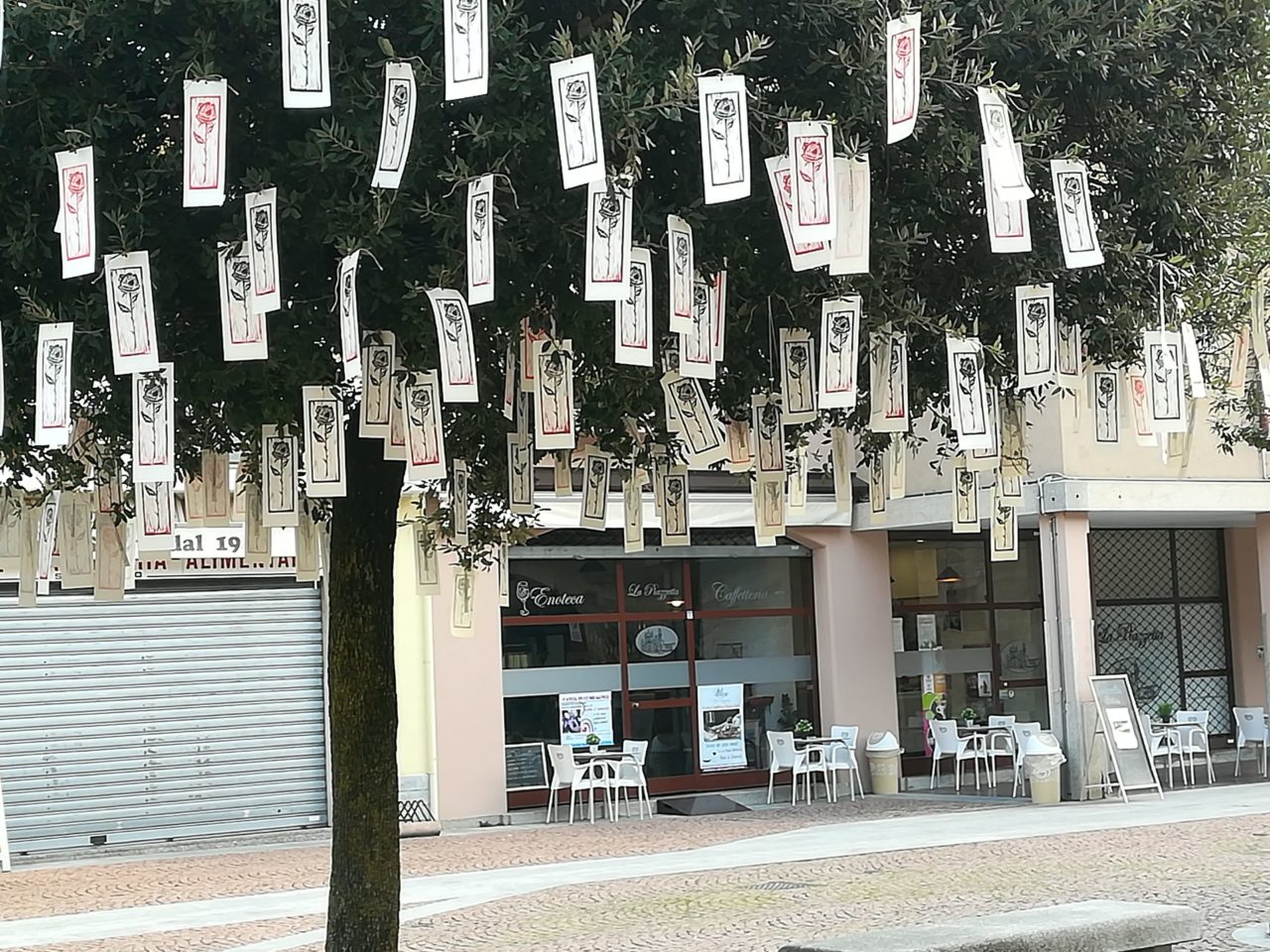 L’opera, composta da centinaia di stampe realizzate a mano di rose rosse e nere appese ad un albero della piazza, ha come obiettivo quello di attirare l’attenzione e far riflettere su un tema molto attuale e delicato come quello della violenza sulle donne.