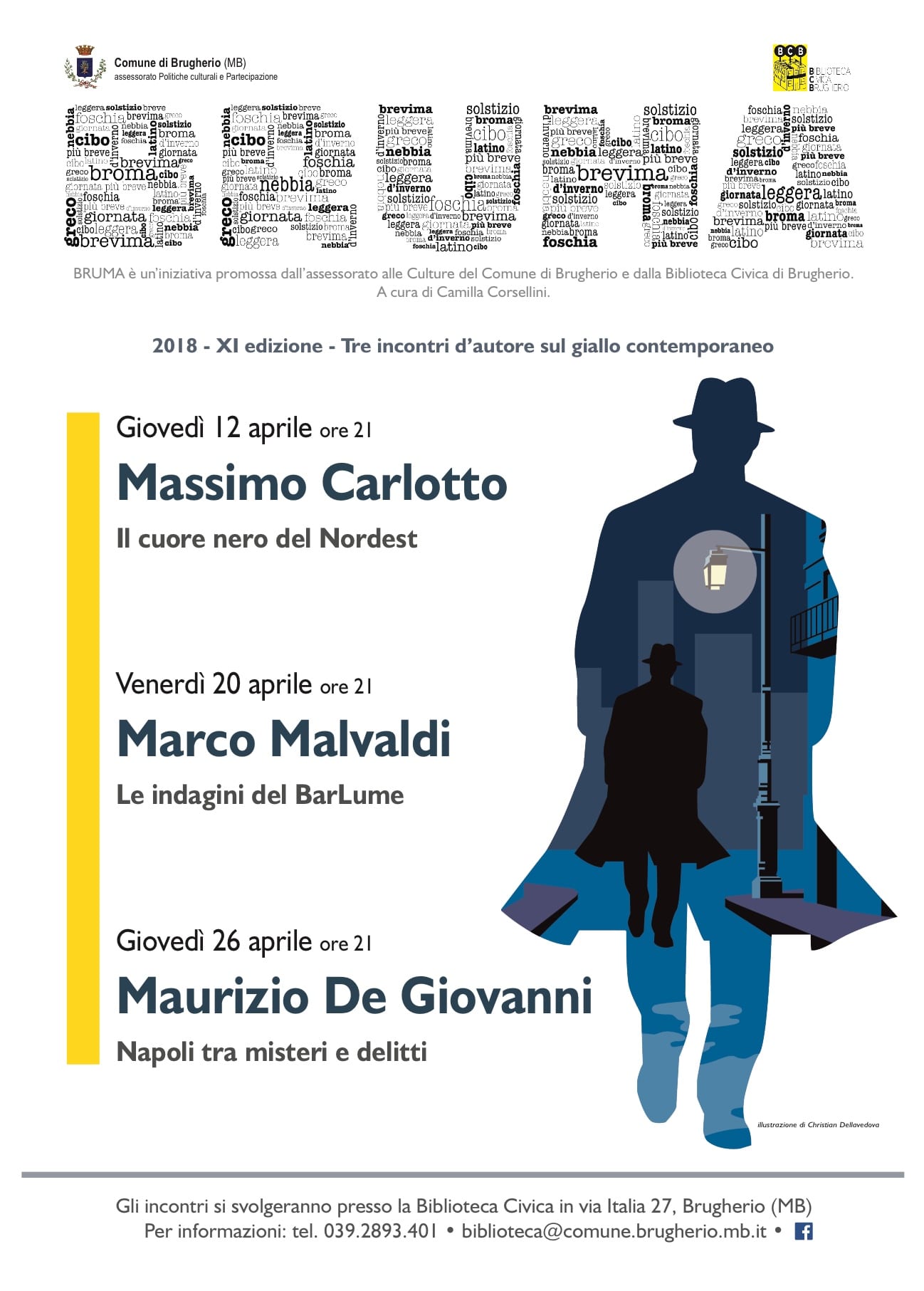 Gli ospiti saranno gli scrittori Massimo Carlotto, Marco Malvaldi e Maurizio De Giovanni, tre fra i migliori italiani che, secondo la formula consolidata di Bruma, saranno protagonisti di serate monografiche che ripercorreranno tutta la loro bibliografia.