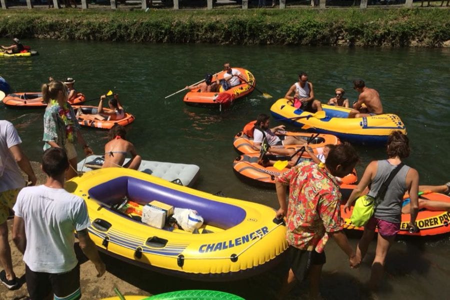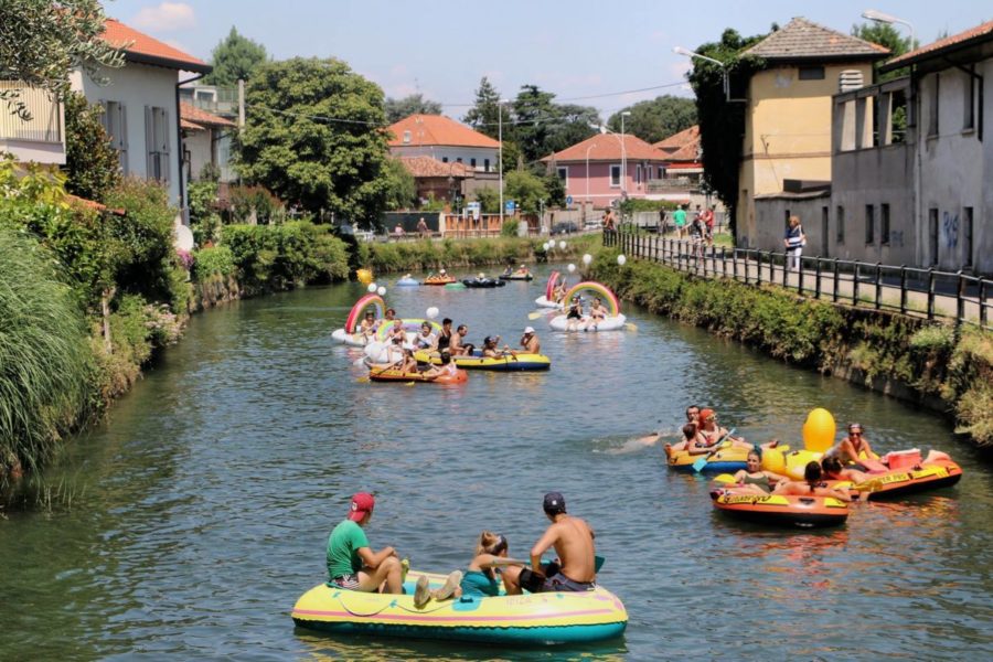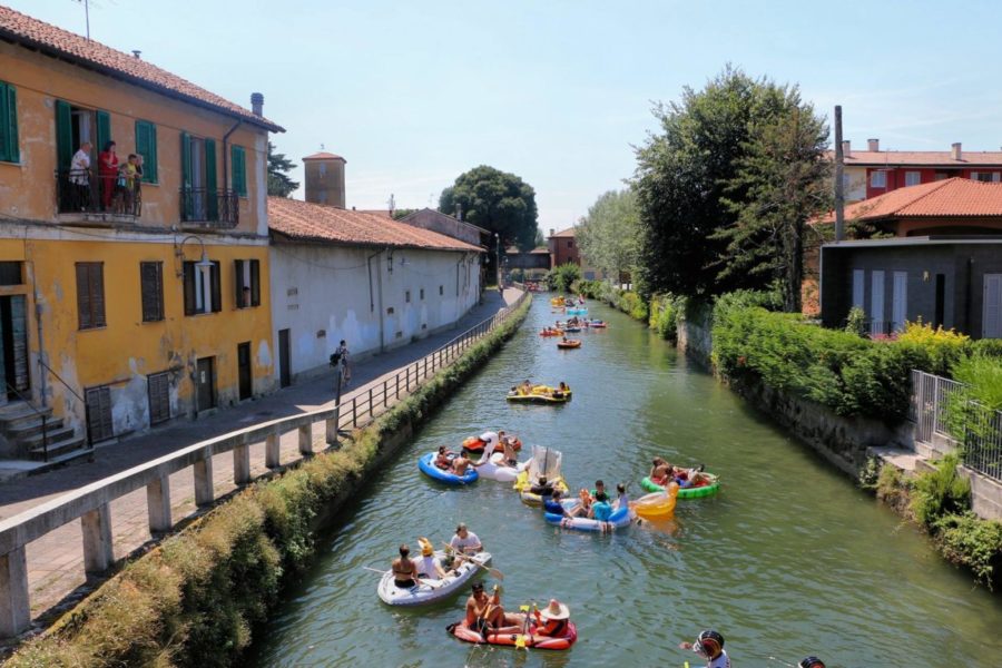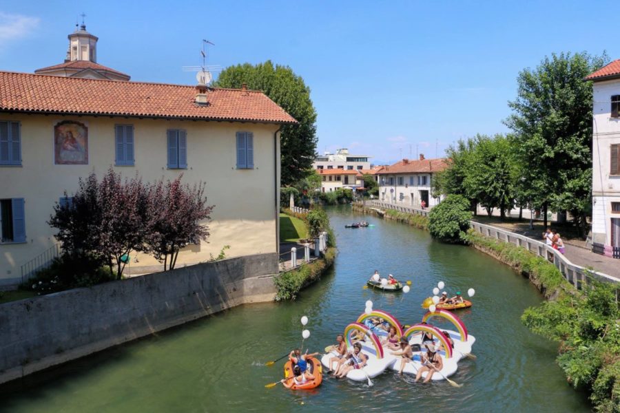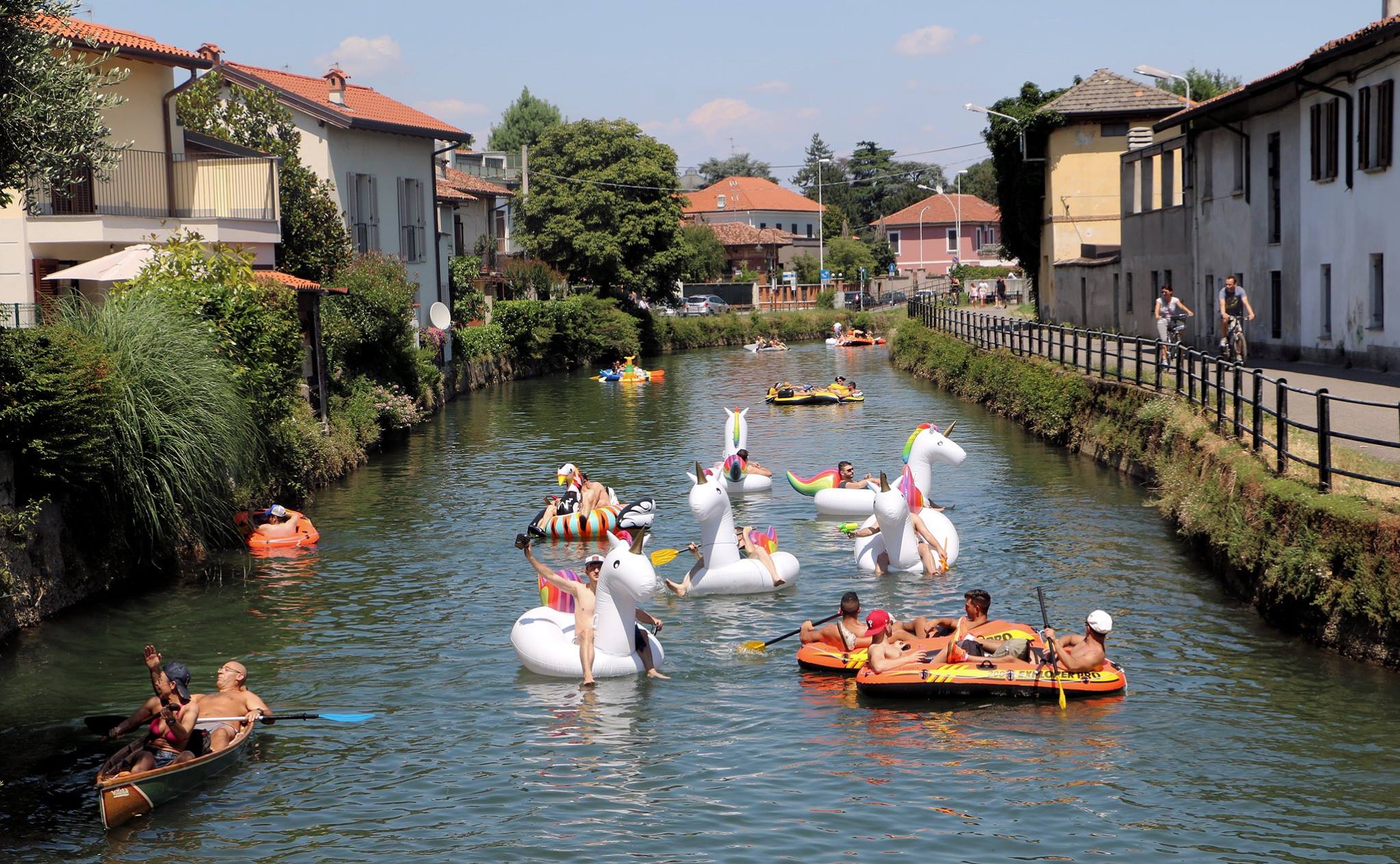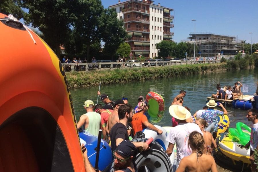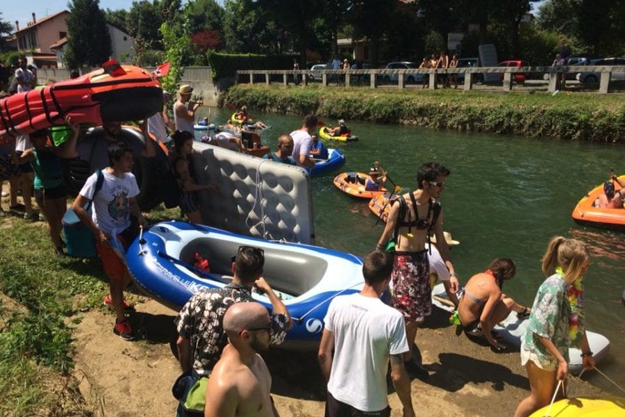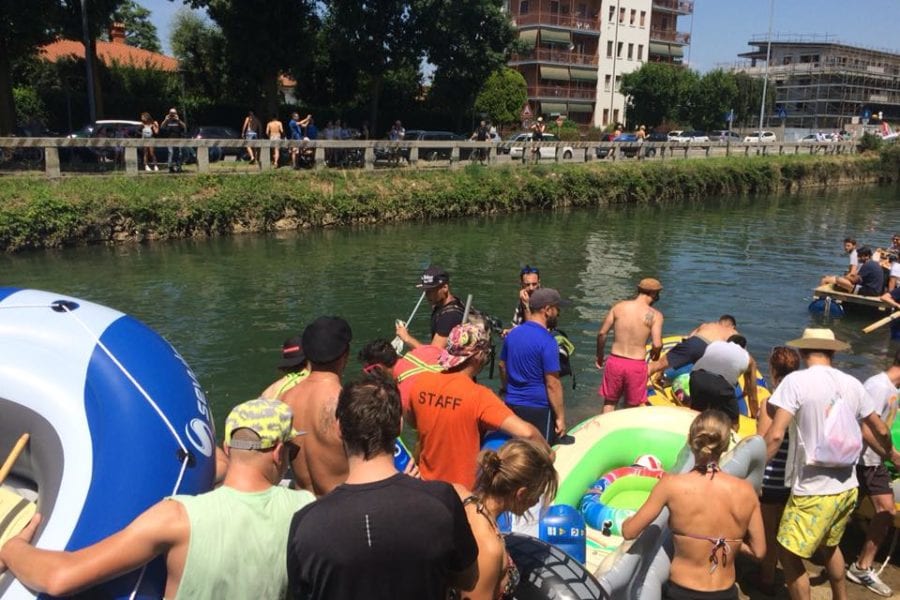 In tantissimi, a bordo di canotti, materassini da mare e gonfiabili di ogni genere, forma e colore, hanno attraversato le acque del naviglio da Gorgonzola a Cernusco armati di remi di fortuna, in una regata che non ha niente di tradizionale e tutto di spettacolare.