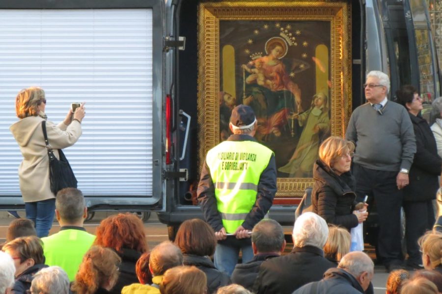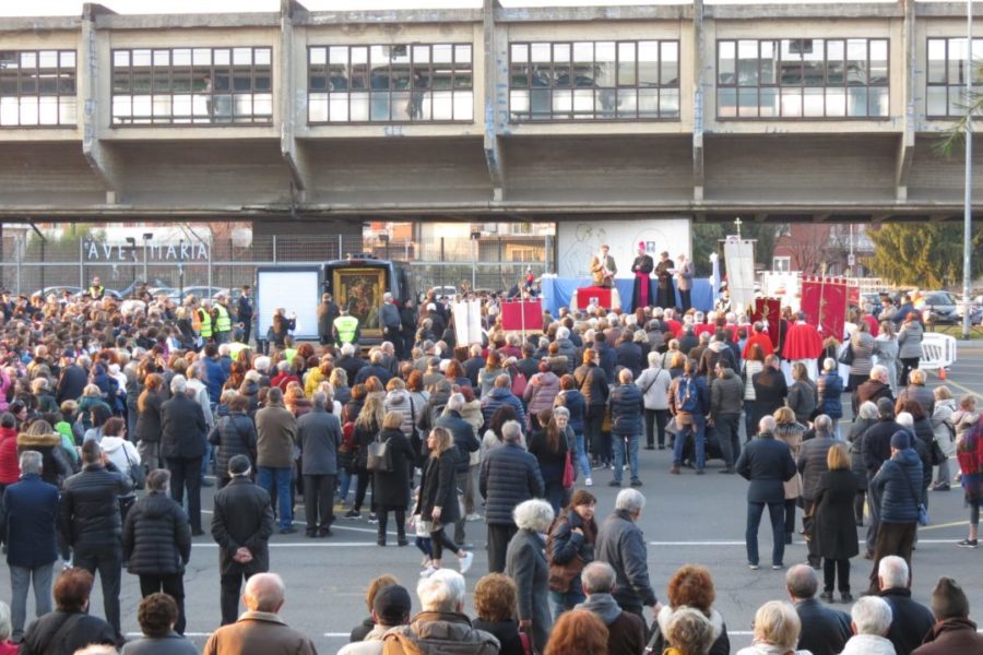 Una vera e propria folla di migliaia di persone che dopo aver accolto l’équipe missionaria, guidata da Monsignor Francesco Paolo Soprano e ascoltato le parole dell’Arcivescovo di Pompei, Monsignor Tommaso Caputo, ha accompagnato l’icona pellegrina della Beata Vergine del Rosario di Pompei con un lungo corteo alla chiesa di Santa Maria Ausiliatrice.