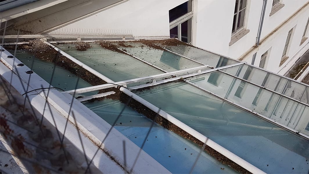 Gli operai del Comune hanno ispezionato il tetto coadiuvati dall’impresa che nel corso della scorsa estate aveva eseguito i lavori di impermeabilizzazione, e da subito era apparso evidente lo stato di sporcizia causato dalla presenza massiccia di guano di piccione che, nonostante i dissuasori preposti – e forse anche a causa delle scarsissime piogge invernali – si è accumulato davanti alle canaline di scolo delle acque meteoriche ostruendole completamente.