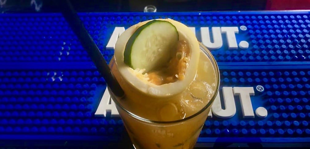 Dopo aver aggiunto una decina di cubetti di ghiaccio, versate nel bicchiere 90 ml di succo di ananas e 60 ml di estratto di melone. Nel caso in cui non aveste un estrattore a portata di mano, potete sostituire l’estratto di melone con un tè fruttato.