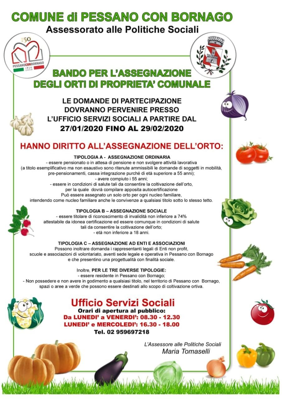Lunedì 27 gennaio a Pessano con Bornago parte ufficialmente il nuovo bando per l’assegnazione degli orti di proprietà comunale. Un’iniziativa che prosegue da diversi anni ormai e che, dal 2016, si rivolge non solo agli over 55, ma anche ai cittadini con invalidità e alle associazioni del territorio. Un’occasione di aggregazione e socialità, che porta con sé anche l’obiettivo di dare vita a nuovi progetti di inclusione alla cittadinanza.