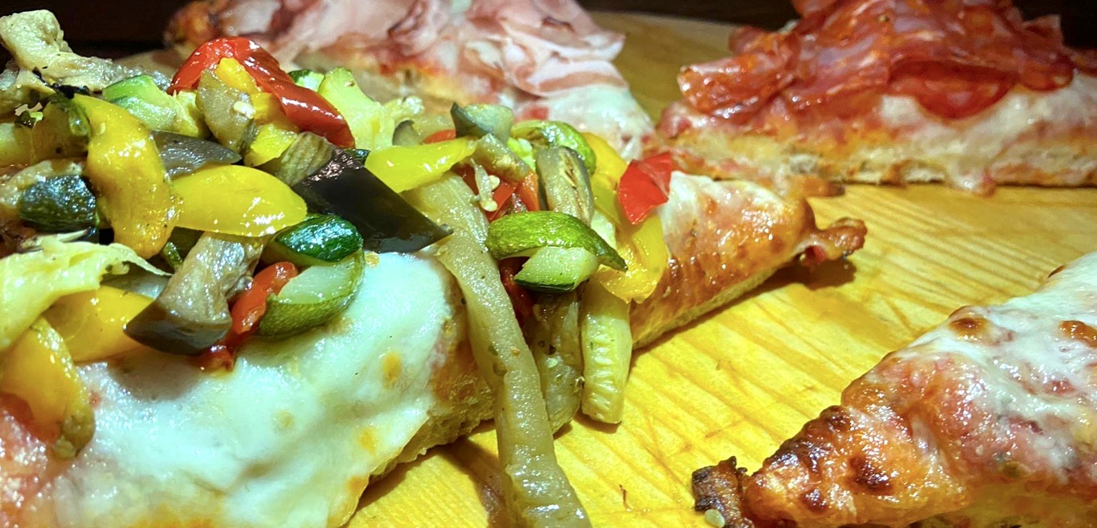 I diversi topping a disposizione – aggiunti rigorosamente a temperatura ambiente – danno vita a sei diverse varietà di pizza, tutte a base margherita, che possono essere servite in due tagli: normale o abbondante.