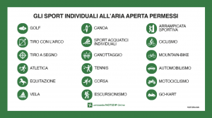 L’ordinanza regionale specifica che tutte le attività consentite potranno svolgersi soltanto rispettando tutte le misure sanitarie già in vigore. In aggiunta, «i gestori che rendono accessibili le aree adibite alla pratica sportiva all’aria aperta non potranno aprire luoghi al chiuso o di assembramento come palestre, spazi di socializzazione, bar e ristoranti, docce e spogliatoi».