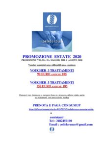 Ma la sicurezza e voglia di fare per la ripartenza non bastano. Il covid-19, oltre a creare una vera e propria emergenza sanitaria, ha portato con sé non poche difficoltà economiche dovute alle chiusure forzate. Chi si occupa di benessere deve avere quindi la capacità di offrirlo tenendo conto delle condizioni esterne, senza vivere in una sfera di cristallo. Proprio per questo motivo Lorenzo Colle ha pensato ad una promozione (in locandina) valida da maggio ad agosto 2020, con l’obiettivo di coniugare esigenze del cliente e guadagno.