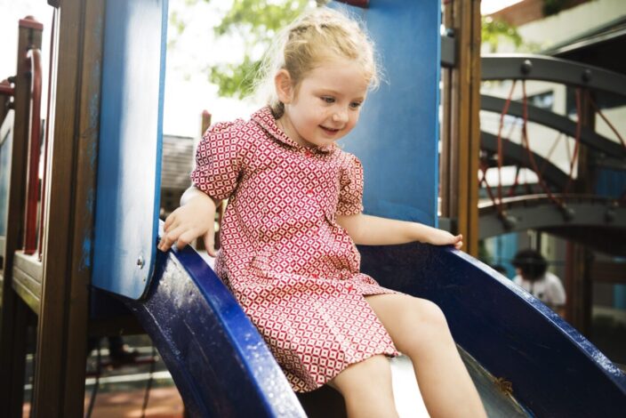 Young girl playing slide in playground