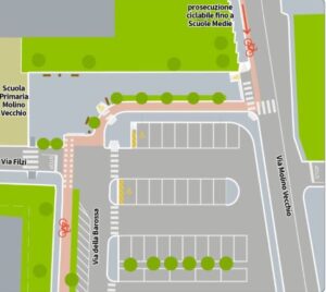Il secondo intervento, con un costo di circa 50.000 €, prevede la realizzazione di una platea rialzata di 15 cm che consentirà l’allargamento dello spazio pedonale per scoraggiare la sosta irregolare e facilitare l’arrivo degli studenti tramite piedibus e migliorerà lo spazio come luogo di aggregazione, sosta e incontro. L’utenza diversamente abile vi potrà accedere tramite appositi scivoli così come i mezzi di soccorso e gli operatori addetti alla manutenzione tramite due rampe carrabili, rispettivamente su via Molino Vecchio e via della Barossa.