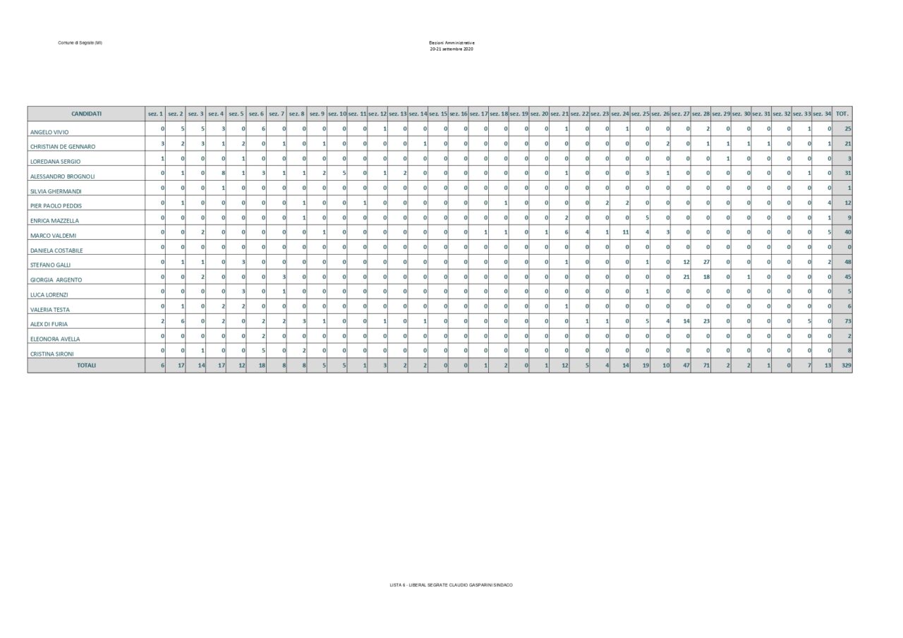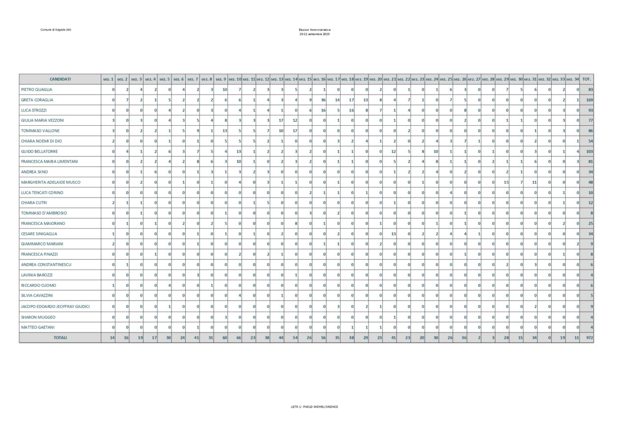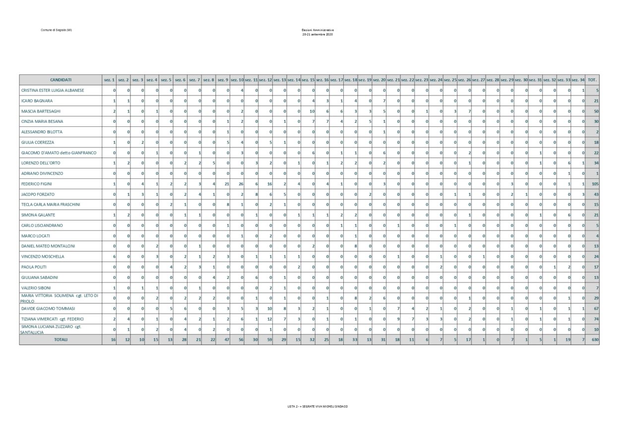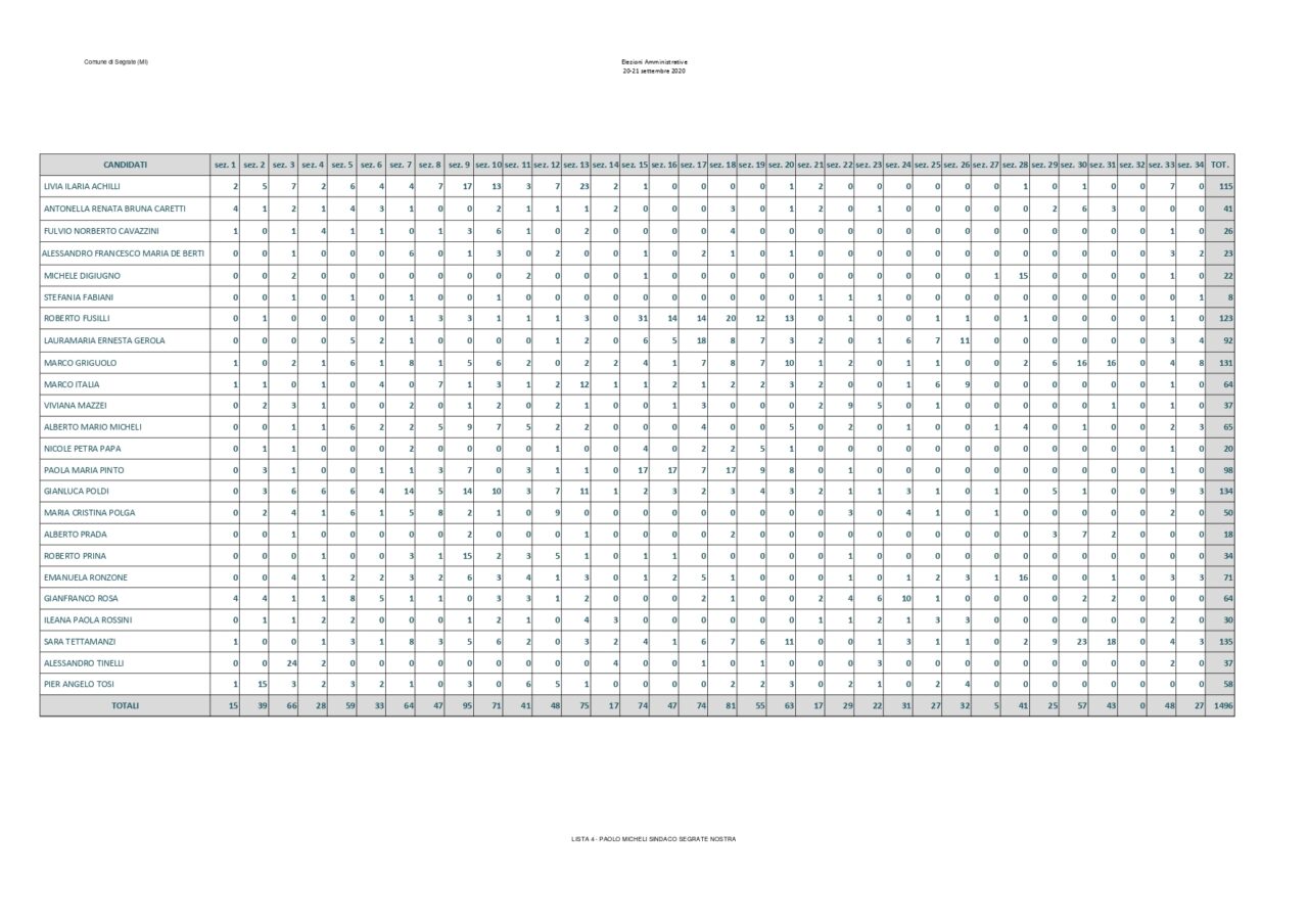 Saranno 6 i candidati della Lista Paolo Micheli che hanno ottenuto più preferenze a trovare posto nel nuovo consiglio comunale. Assieme a loro anche i consiglieri di opposizione Luca Sirtori e Laura Aldini. Rimangono fuori Arabsolgar, Viganò e Gasparini. Di seguito il dettaglio: