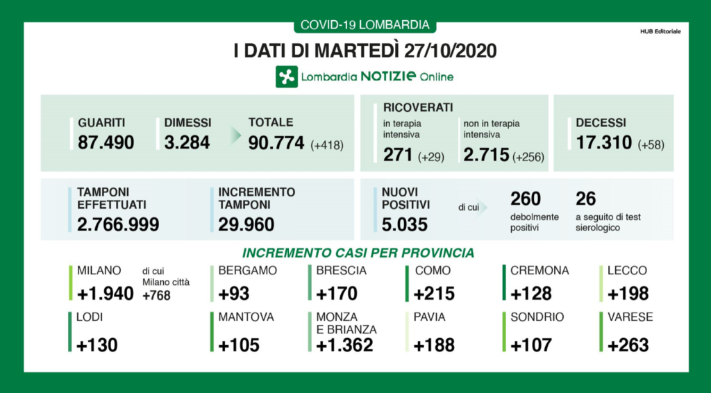 Si registrano oggi sul portale di Regione Lombardia 5.035 nuovi casi, su 29.960 tamponi effettuati (16,8%). Aumentano le terapie intensive, che con 29 nuovi ingressi arrivano al totale di 271, mentre sono 2.715 (+256) i ricoveri ospedalieri. In provincia di Milano i positivi registrati oggi sono 1.940. Consulta qui la mappa aggiornata dei contagi in Martesana, comune per comune.