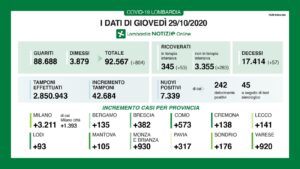 Oggi si registrano 7.339 nuovi positivi, a fronte di 42.684 tamponi con una percentuale che rispetto a ieri si abbassa lievemente al 17,1%. Aumentano di 53 unità le terapie intensive (345), mentre i ricoverati non in terapia intensiva risultano 3.355 (+283). I decessi sono stati 57, 10 in più di ieri, per un totale complessivo di 17.414. La provincia di Milano e quella di Monza e Brianza sono le zone che registrano più contagi, rispettivamente 3.211 e 930. Guarda qui la mappa dei contagi in Martesana.