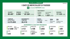 Tra i casi positivi in Lombardia sono 1.521 i ricoverati con sintomi, mentre le terapie intensive registrate sono 134. L’aumento vertiginoso dei casi arriva a ridosso dell’entrata in vigore della nuova ordinanza firmata da Fontana questa mattina, che stabilisce il coprifuoco dalle 23 alle 5.