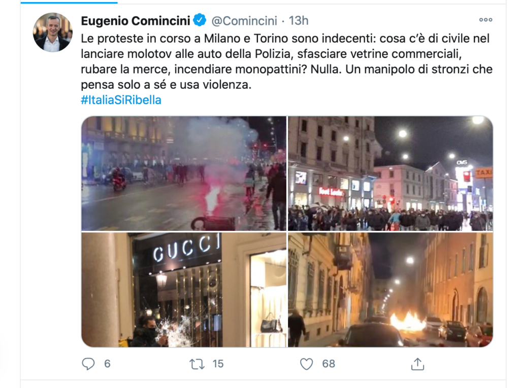 ha scritto -: cosa c’è di civile nel lanciare molotov alle auto della polizia, sfasciare vetrine commerciali, rubare la merce e incendiare monopattini? Nulla. Un manipolo di stronzi che pensa solo a sé e usa la violenza».