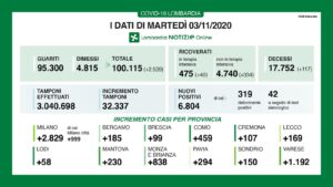 I dati di oggi in Lombardia si aprono con una nota positiva: sono 2.539 i nuovi guariti/dimessi, con cui si supera quota 100.000. Sono 6.804 i positivi, con 32.337 tamponi effettuati, per una percentuale pari al 21%. Le persone in terapia intensiva sono 475, con 40 nuovi ricoveri, mentre le persone ricoverate non in terapia intensiva arrivano aumentano di 334 e arrivano a 4.740. Oggi si registrano 117 decessi. Nella provincia di Milano 2.829 nuovi positivi, qui la mappa dei contagi in Martesana.