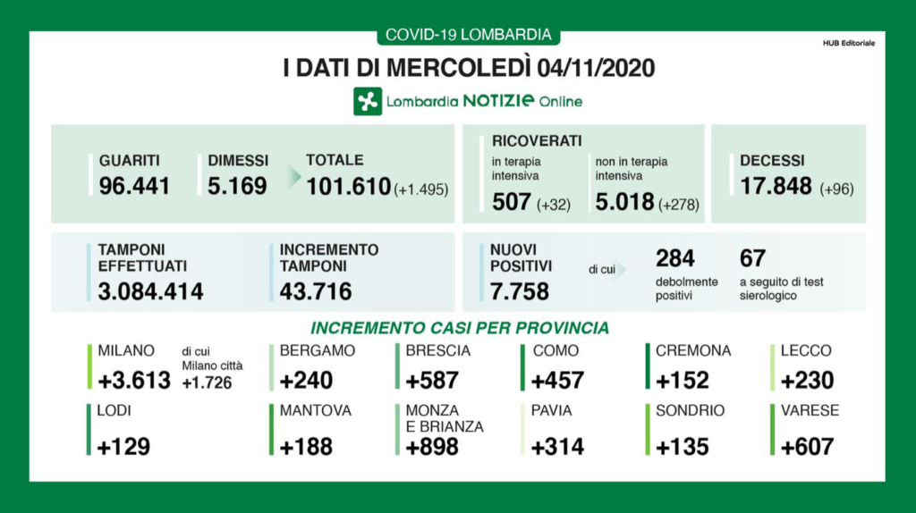 Sono 7.758 i positivi, con 43.716 tamponi effettuati, per una percentuale pari al 17,7%. Le persone in terapia intensiva sono 507, con 32 nuovi ricoveri, mentre le persone ricoverate non in terapia intensiva aumentano di 278 e arrivano a 5.018. Oggi si registrano 96 decessi. Nella provincia di Milano sono 3.613 i nuovi positivi, qui la mappa dei contagi in Martesana