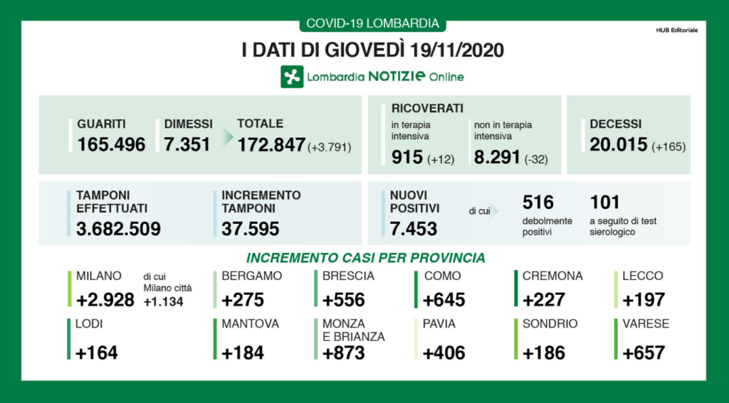 Sono 7.453 i nuovi positivi oggi in Lombardia, con 37.595 tamponi effettuati, per un rapporto pari al 19,8%. I guariti e i dimessi sono complessivamente 3.791, mentre calano di 32 le persone ricoverate, per un totale di 8.291. In terapia intensiva il numero sale di 12 e arriva a 915 ricoveri totali.I decessi sono 165. Nella provincia di Milano i nuovi positivi sono 2.928. Qui la mappa dei casi in Martesana.