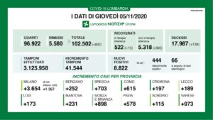 Sono 8.822 i nuovi positivi in Lombardia, su un numero di tamponi effettuati pari a 41.544. Il rapporto tra i tamponi e i nuovi positivi è del 21,2%. I guariti o dimessi sono 892. Le persone in terapia intensiva sono 522 (+15), mentre i ricoverati non in terapia intensiva sono 5.318 (+300). Il numero di decessi registrato oggi è di 139, per un totale complessivo di 17.987. Nella provincia di Milano sono 3.654 i nuovi positivi. Qui la mappa dei contagi in Martesana.