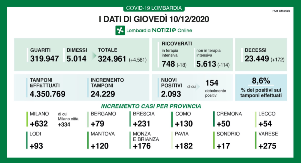 Coronavirus, i dati in Lombardia di giovedì 10 dicembre