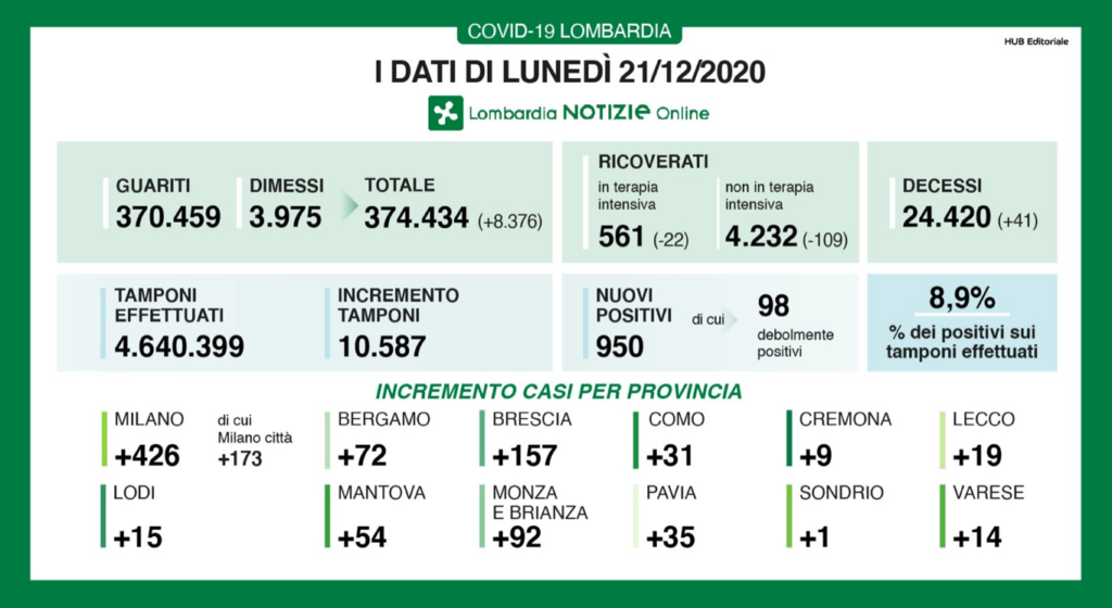 Sono 950 i nuovi positivi oggi in Lombardia, con 10.587 tamponi effettuati, per un rapporto pari al 8,9%. I guariti e i dimessi sono complessivamente 8.376. Sono 109 in meno le persone ricoverate, che arrivano così a 4.232. In terapia intensiva il numero scende di 22 per un totale di 561 ricoveri. I decessi sono 41. Nella provincia di Milano i nuovi positivi sono 426. Qui la mappa dei contagi in Martesana.