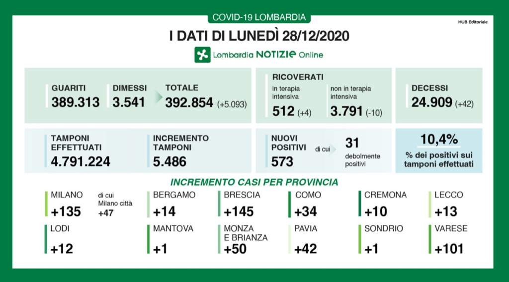 Sono 573 i nuovi positivi oggi in Lombardia, con 5.486 tamponi effettuati, per un rapporto pari al 10,4%. I guariti e i dimessi sono complessivamente 5.093. Sono 10 in meno le persone ricoverate, che arrivano così a 3.791. In terapia intensiva il numero sale di 4 per un totale di 512 ricoveri. I decessi sono 42. Nella provincia di Milano i nuovi positivi sono 135.