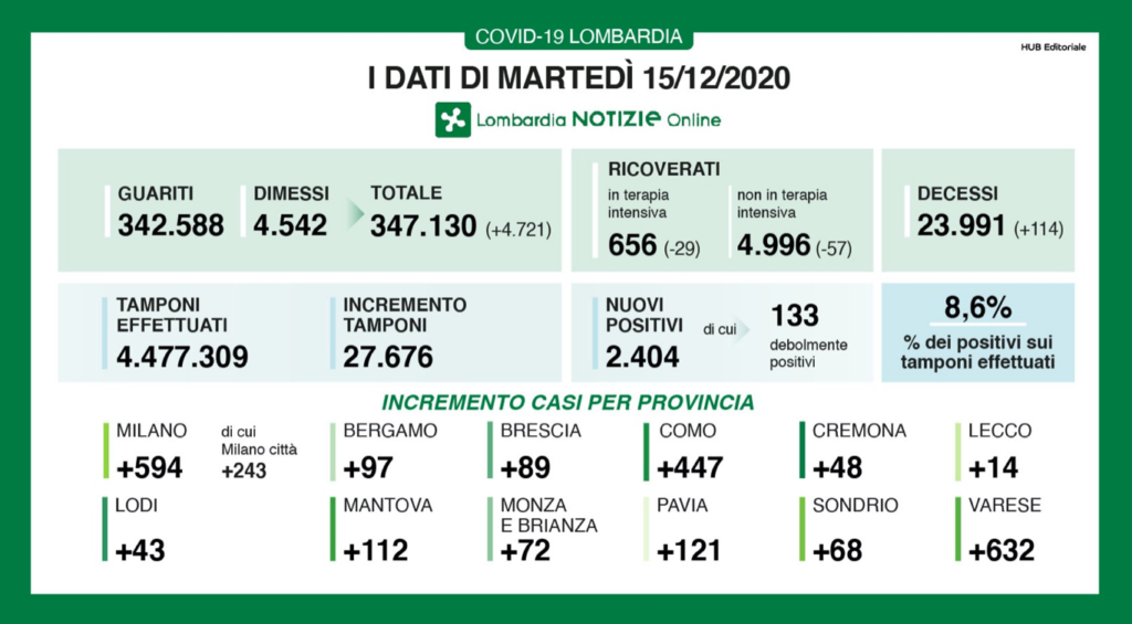 Sono 2.404 i nuovi positivi oggi in Lombardia, con 27.676 tamponi effettuati, per un rapporto pari al 8,6%. I guariti e i dimessi sono complessivamente 4.721. Sono 57 in meno le persone ricoverate, che arrivano così a 4.996. In terapia intensiva il numero scende di 29 per un totale di 656 ricoveri. I decessi sono 114. Nella provincia di Milano i nuovi positivi sono 594. Qui la mappa dei contagi in Martesana.