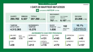 Sono 1.656 i nuovi positivi oggi in Lombardia, con 16.276 tamponi effettuati, per un rapporto pari al 10,1%. I guariti e i dimessi sono complessivamente 5.699. Sono 175 in meno le persone ricoverate, che arrivano così a 6.187. In terapia intensiva il numero scende di 14 per un totale di 767 ricoveri. I decessi sono 128. Nella provincia di Milano i nuovi positivi sono 420. Qui la mappa dei contagi in Martesana