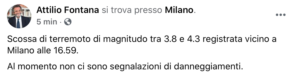 Avvertite scosse di terremoto, Giovedì 17 dicembre alle 16.59 nella zona di Milano. Arrivano segnalazioni anche dai comuni della Martesana, dalla Brianza e dalle province di Como e Lecco. Le prime stime dell’Istituto Nazionale di Geofisica e Vulcanologia parlano di una magnitudo compresa tra 3.8 e 4.3. L’epicentro è stato a Trezzano sul Naviglio a 8 Km di profondità.