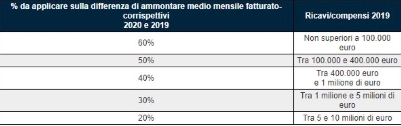 Il contributo è determinato applicando una percentuale alla differenza tra il fatturato medio mensile 2020 e quello 2019, determinata come da tabella: