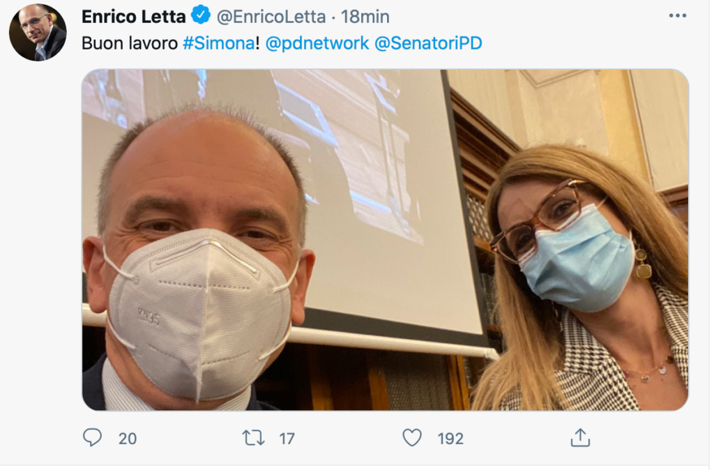 «Simona Flavia Malpezzi è stata appena eletta capogruppo dei Senatori PD. Buon lavoro Simona! Grazie ad Andrea e a tutte le senatrici e i senatori del Partito Democratico. Al lavoro al servizio dell’Italia».
