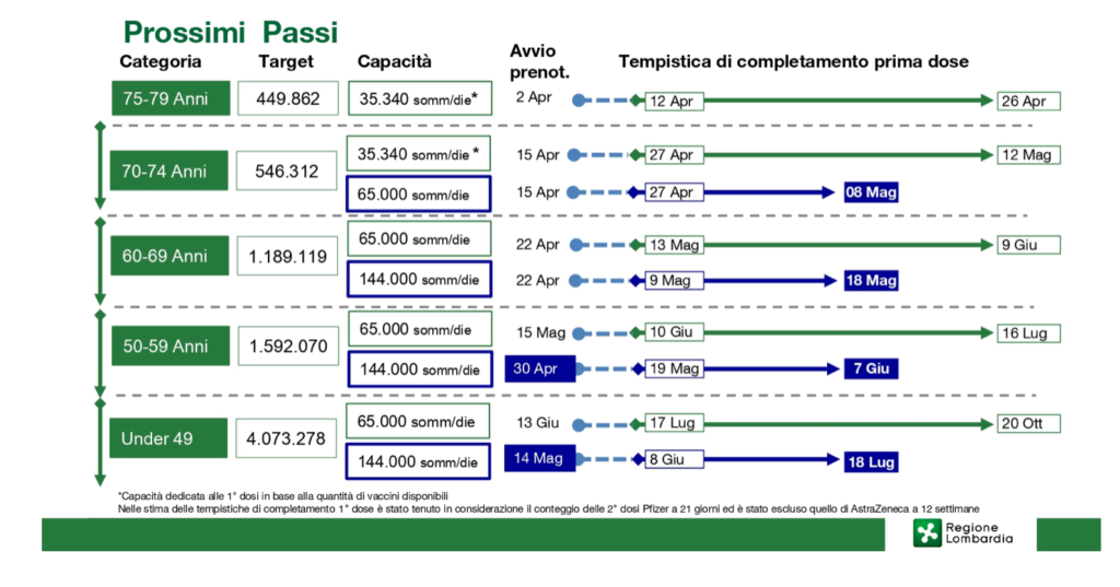 Con l’incertezza sull’arrivo delle dosi di vaccino e la nuova linea italiana su AstraZeneca, che consiglia l’utilizzo solo agli over 60, è difficile ipotizzare tempi certi per la campagna vaccinale. Qui di sotto uno schema riassuntivo del piano presentato lo scorso primo aprile in conferenza stampa da Guido Bertolaso, coordinatore della campagna vaccinale in Lombardia.