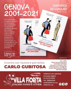 A vent’anni esatti dai fatti avvenuti durante il G8 di Genova, lo scrittore Carlo Gubitosa presenterà a Cernusco sul Naviglio il libro, scritto assieme a Mauro Biani, Abbiamo ragione da vent’anni, La contestazione al G8 del 2001 nelle lotte sociali del 2021 pubblicato dalla casa editrice People. L’appuntamento, voluto da moltissime associazioni cernuschesi (Acli Cernusco sul Naviglio, Anpi Cernusco Sul Naviglio, Operazione Cachoeira De Pedras, Cernusco in Comune, CGIL, ColorEsperanza, Coraggiosa, Futura, Nazca Mondoalegre – bottega di Cernusco sul Naviglio, UDI Donne di Oggi, in collaborazione con Libreria del Naviglio) si svolgerà Giovedì 22 luglio alle ore 21 nello spazio di Villa Fiorita.
