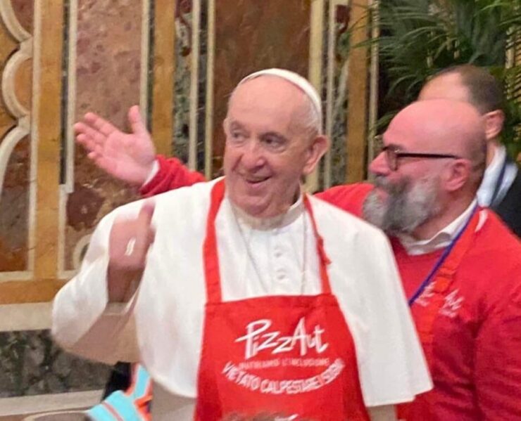 Una trasferta davvero speciale, quella che avevamo già annunciato e che si è concretizzata il 1 aprile per i ragazzi di PizzAut, che da Cassina hanno raggiunto il Papa per presentargli il loro lavoro e offrirgli “Cantico delle Creature“: una margherita con base rossa, mozzarella, pomodorini freschi e basilico, è questa la pizza che è stata preparata sotto il colonnato di San Pietro pensata per Papa Francesco.