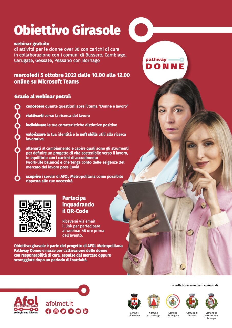 in collaborazione con i comuni di Bussero, Cambiago, Carugate, Gessate, Pessano con Bornago ha organizzato per Mercoledì 5 ottobre il webinar gratuito “Obiettivo Girasole”, per le donne over 30 con carichi di cura in collaborazione.