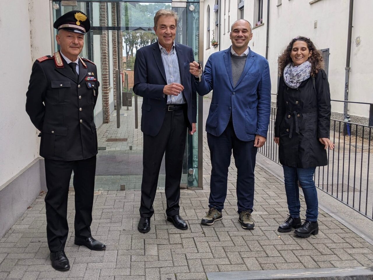 vandalici, e di sensibilizzazione della cittadinanza alle tematiche afferenti alla legalità. All’Associazione Nazionale Carabinieri è stato assegnato un ufficio con parete a vetro al piano terra, ed è stata consegnata una copia delle chiavi dell’ingresso laterale. Venerdì pomeriggio la simbolica consegna delle chiavi, alla presenza del Sindaco Ermanno Zacchetti, dell’Assessore al Progetto Filanda Debora Comito, del Tenente Giuseppe Sfameni (presidente dell’Associazione) e del Maresciallo Giuseppe Palmeri.