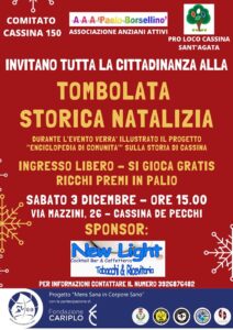 Il Comitato Cassina 150 e la Pro Loco di Cassina De Pecchi, con il supporto logistico e organizzativo dell’Associazione Anziani Attivi “Paolo Borsellino”, hanno organizzato una Tombolata Storica Natalizia. L’appuntamento, al quale tutta la cittadinanza cassinese è invitata a partecipare, è per sabato 3 dicembre alle ore 15.00 in Via Mazzini, 26 a Cassina proprio presso il Centro Borsellino.
