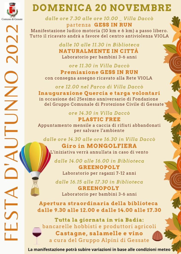 Domenica 20 Novembre le vie, le strade e le piazze di Gessate si animeranno in onore di una grande festa che celebra la colorata stagione autunnale. Davvero tantissime e molto varie le iniziative di questa giornata: ce n’è per tutti i gusti ed età.