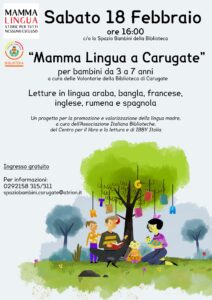 Ogni lingua è preziosa, e l’ascolto, fin dalla tenera età,di diverse lingue straniere aiuta a sviluppare diverse capacità. Le narrazioni e le storie aiutano ad arricchire il vocabolario ed allo stesso tempo rappresentano dei ponti tra culture diverse. La biblioteca cittadina di Carugate è ancora una volta punto d’incontro anche per bambini e genitori che parlano lingue diverse. Un progetto per la promozione e valorizzazione della lingua madre, a cura dell‘Associazione Italiana Biblioteche, del Centro per il libro e la lettura e di IBBY Italia.