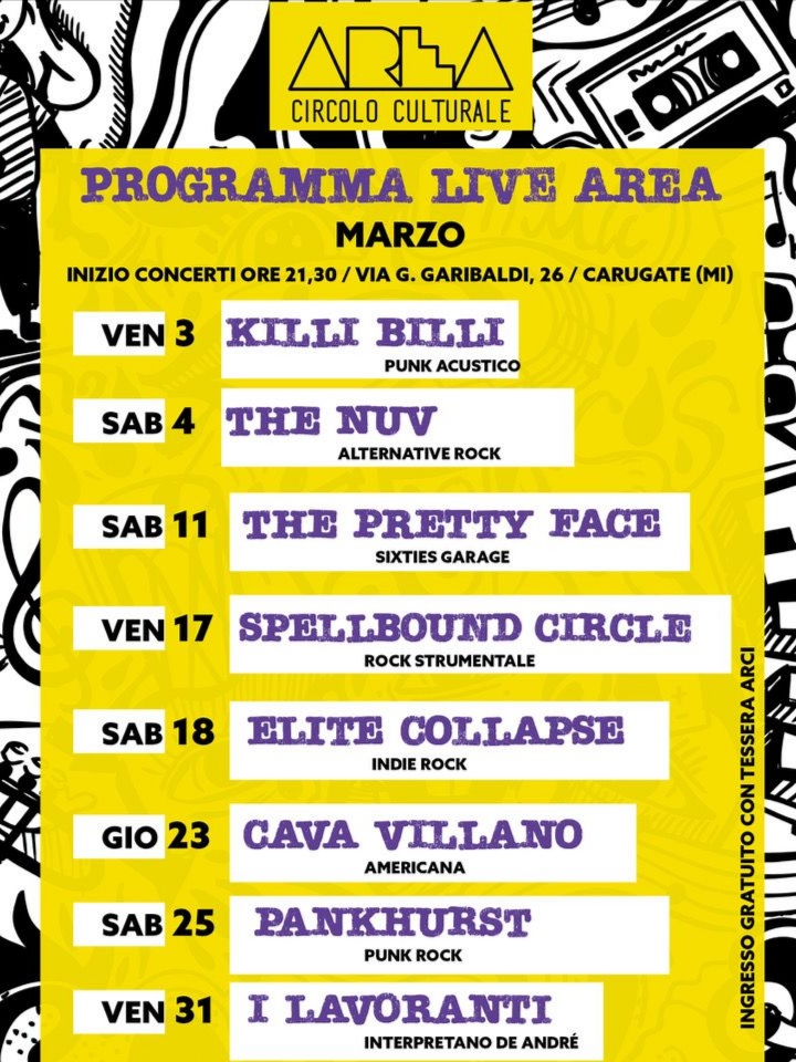 Dopo la ripartenza dello scorso novembre all’insegna della musica dal vivo, anche per la primavera il C.C. Area di Carugate continua con una programmazione ricca di band pronte a calcare il palco di via Garibaldi 26.