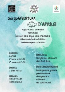 Il ritrovo è previsto per Sabato 1 aprile presso la Biblioteca Civica ” Franco Galato” in via Montenero 30 a Gorgonzola, l’evento sarà articolato in due turni dalla durata di 1 ora e mezza ciascuno e rivolto a famiglie con bambini dai 3 ai 10 anni. I due turni saranno cosi articolati: il primo turno alle ore 14.30 e il secondo alle ore 15.30. L’evento parlerà delle acque della Martesana, con un laboratorio ludico didattico e la creazione di un opera collettiva.
