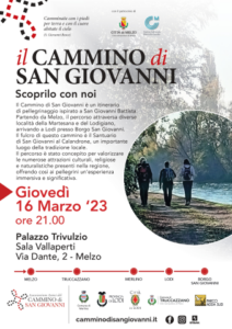 L’Associazione Amici del Cammino di San Giovanni, con il patrocinio del Comune di Melzo e in collaborazione con l’Associazione Culturale “Marcello Candia”, ha organizzato una serata evento alla scoperta di “Il Cammino di San Giovanni”. L’appuntamento, a ingresso libero, è fissato per giovedì 16 marzo alle 21.00 presso la Sala Vallaperti di Palazzo Trivulzio.