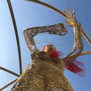 La scultura è composta da cinque figure di donna, scolpite a grandezza naturale e placcate in oro 24kt, racchiuse in una sfera alta ben 4 metri. Al centro di essa c’è una vittima, una ragazza che ha subito realmente violenza nella sua vita: si trova al centro dell’opera ed è rappresentata in posizione di difesa, simbolo della speranza, perché lei ha ripreso in mano la sua vita. Le ragazze intorno rappresentano i quattro sentimenti: due passivi e due attivi. Essi sono la paura, rappresentata da una ragazza ferma con le braccia lungo i fianchi e gli occhi bendati, la denuncia di chi non vuol vedere e fa finta di niente, mentre l’altra è la costernazione, un’amica che si sente con le mani legate. Poi ci sono i due sentimenti attivi: