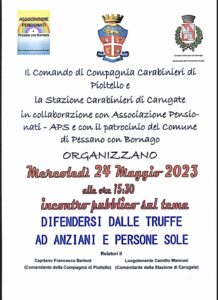 L’appuntamento è per mercoledì 24 maggio alle ore 15.30, presso la Sede dell’Associazione Pensionati di Pessano in Piazza Della Resistenza 6. I relatori dell’evento saranno il Capitano Francesco Berloni (Comandante della Compagnia di Pioltello) e il Luogotenente Camillo Mancusi (Comandante della Stazione di Carugate). L’evento è aperto a tutti.