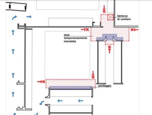La fase 2, dal 29 maggio al 1°giugno, prevede il montaggio del ponteggio per le lavorazioni in quota e il trattamento dei ferri affioranti. Viene pertanto precluso il passaggio delle persone per un periodo temporale limitato a 3 giorni nelle aree segnalate di colore rosso e l’accesso all’ala nord sarà garantito mediante il percorso alternativo segnalato dalle frecce in colore blu.