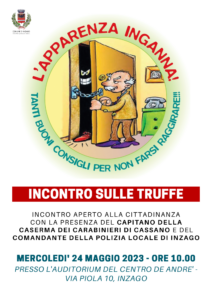 L’appuntamento è per mercoledì 24 maggio alle ore 10.00 presso l’Auditorium Del Centro de Andre’ in via Piola 10 ad Inzago. L’incontro sarà gratuito ed aperto a tutta la cittadinanza e vedrà la presenza del Capitano della Caserma dei Carabinieri di Cassano e del Comandante della Polizia Locale di Inzago.