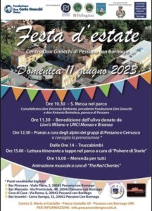 alle ore 12.30  sarà previsto il pranzo a cura degli alpini dei gruppi di Pessano e Cernusco (si consiglia la prenotazione)dalle Ore 14 – Truccabimbi alle re 15.00 Lettura itinerante a tappe nel parco a cura di “Polvere di Storie” e alle ore 16.00 sarà servita la merenda per tutti. L’ Animazione musicale sarà a cura di “The Red Cherries”.
