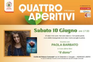 La  rassegna letteraria del Comune di Carugate con “Quattro aperitivi” Questo sabato, 10 giugno ore 17:00 incontreremo PAOLA BARBATO con il suo libro “Il Dono” per tutte le informazione Clicca qui