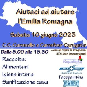 Sabato 10 giugno, dalle 8 alle 18.30, la Croce Bianca Milano sezione Brugherio, l’Associazione Kupalinka e la sezione brugherese degli Alpini organizzano, in collaborazione con Carrefour Carugate e Centro Commerciale Carosello una grande raccolta dialimentari, articoli di igiene intima e sanificazione della casa da destinare alle popolazioni dell’Emilia Romagna. E per i più piccoli: facepainting BiaBru dalle 10 alle 17. La successiva consegna di tutto il materiale sarà a cura dei Leo Lions International!